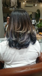 後ろからの写真です。巻いて、いい感じにアッシュの透け感とバイオレッドとブルーが表現できています。